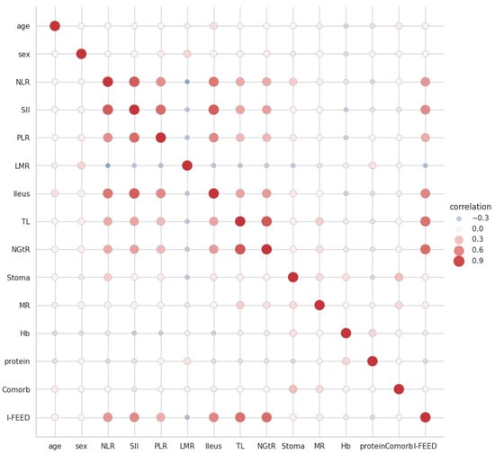 The plot of the correlation matrix for the measured variables. NLR, neutrophil-to-lymphocyte ratio; SII, systemic immune-inflammation index; PLR, platelet-to-lymphocyte ratio; LMR, lymphocyte-to-monocyte ratio; Hb, hemoglobin; TL, toleration for liquids; NGtR, nasogastric tube reinsertion; MR, multiorgan resection; Comorb, number of comorbidities.