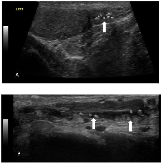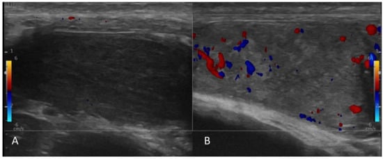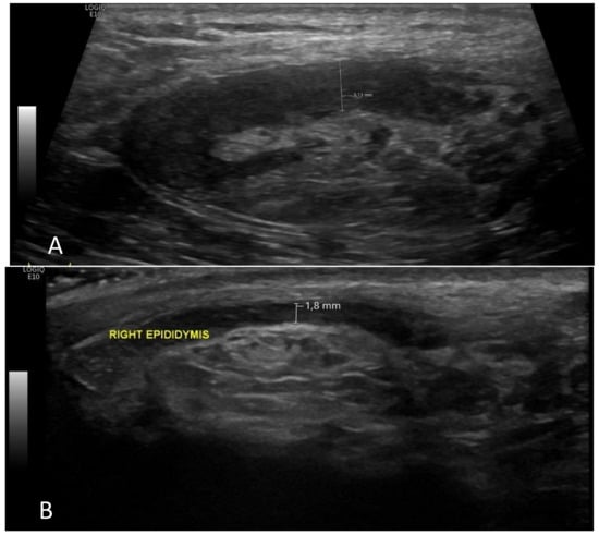 During 2020, the patient noticed a runny nose and a feeling of swelling in the nose and recalled that he had problems with nasal polyps 20 years prior. The patient was referred to otorhinolaryngologist, who found a small greyish polyp in the meatus media and sphenoidal compartment on the right side, as well as more polyps on the left side further back in the sphenoidal compartment, originating from ethmoidal cells. A biopsy was performed, and histopathology showed strongly elevated IgG4 plasma cells (>50 per high power field and IgG4/IgG ratio > 40). (Figure 1). Saline rinse and mometasonfuroat nasal spray were recommended. At the same time (2020), the patient experienced coughing with a little slime and was referred to a pulmonologist. A CT of the thorax was performed, which showed a spiculated infiltrate in the left lung apex that had increased in size considerably since 2017 (Figure 2). A CT-guided intermediate needle biopsy was performed, but the results were inconclusive. 18F-fluorodeoxyglucose (FDG) PET/CT showed uptake in the left apex, but it was not possible to differentiate between IgG4 inflammation and malignancy. There was no FDG uptake in the other organs. The serum IgG4 levels were at their highest (14.7 g/L) since 2017. Treatment with 40 mg prednisolone per day was started (before that, a control DXA was performed and showed unchanged osteopenia status; vitamin D and calcium were prescribed as prophylaxis during the steroid treatment). Control CT of the thorax showed significant improvement and regression of the previously described lesions. Prednisolone was tapered to 5 mg per week, and in January 2022, came to a maintained dose of 5 mg per day. In February 2022, the patient was referred to a urology outpatient clinic due to testicular pain, hematuria, dysuria, and fever up to 38 °C. The patient explained that hematuria was, in fact, one occasion of hematospermia. Furthermore, testicular tenderness/pain had been present periodically for at least 10–15 years without any progress, but he had never sought medical help for that. The patient estimated a normal miction frequency and dysuria consisting of a feeling of incomplete bladder emptying. At physical examination, in the standing position, scrotal inspection showed a higher standing right testicle with otherwise normal scrotal configuration. On palpation, both testicles revealed a hard consistency and somewhat uneven shape. The epididymites were tender and enlarged bilaterally, especially in the caudal parts. The distal parts of the funicles were slightly tender, and the patient had a right-sided inguinal hernia. The rectal examination and cystoscopy were normal, with normal bladder cytology. Ultrasound (US) showed aberrant heterogeneous parenchymal structure in the testicles bilaterally, more clearly on the left side, with an appearance of chronic post-inflammatory changes (Figure 3, Figure 4 and Figure 5). There were no signs of focal changes or malignancy. A CT of the kidneys and ureters showed no signs of malignancy in the urinary tract. The patient’s case was discussed with rheumatologists, and he started treatment with rituximab in May 2022. Urological control in September 2022 showed clinical improvement in all symptoms, as well as US (regression of inflammatory changes in testicles and epididymis) and laboratory improvement (serum IgG4 lowered to 3.4 g/L). Control at the pancreas outpatient clinic showed an asymptomatic patient with fecal elastase-1 levels in the normal reference interval (232 μg/g), but lower than the levels during the period of 2018–2020 (>500 μg/g). A graphical case report with the timeline and the most important findings is presented in Figure 6.