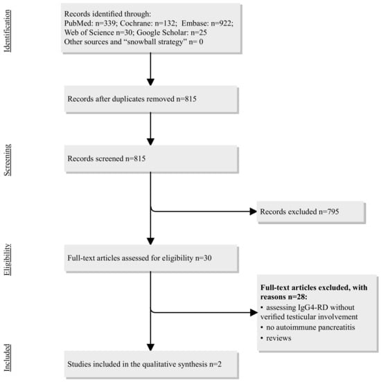 A comprehensive literature search for relevant articles was performed (Scheme 1 and Scheme 2) by four independent authors (M.K., D.B., N.P. and E.F.) in accordance with the Preferred Reporting Items for Systematic Reviews and Meta-Analyses (PRISMA) guidelines, and all disagreements were resolved by the senior authors (MV, JML). Embase, Google Scholar, PubMed, Cochrane, and Web of Science were searched using the following terms: (“Immunoglobulin G4-related disease” or “IgG4-related disease” or “Autoimmune pancreatitis type 1”) and (“testicular” or “testis” or “paratestis” or “orchitis” or “epididymis” or “scrotum”, or “scrotal” or “intrascrotal” or “spermatic cord” or “vas deferens” or “paratesticular pseudotumor” or “tunica vaginalis” or “genitourinary” or “urology”). The aforementioned databases were also searched using the following terms: (“Immunoglobulin G4-related disease” or “IgG4-related disease” or “Autoimmune pancreatitis type 1”) and (“nose” or “nasal cavity” or “nasal polyps” or “rhinitis” or “otorhinolaryngologic diseases” or “otolaryngology” or “otorhinolaryngology” or “paranasal sinuses” OR “nasal sinuses”). The search was limited to studies with human subjects and which had been published before 31 December 2022. Additionally, a manual examination of the references listed by the studies (“snowball method”) retrieved from the online databases and previously published reviews was performed in order to identify other potentially relevant studies for inclusion. We included articles assessing autoimmune pancreatitis type 1 (IgG4-RD) patients with testicular or nasal cavity involvement, with the full text available, published in the English language, with the diagnosis of IgG4-RD (definite or probable) in accordance with the 2020 revised comprehensive diagnostic criteria [11]. Literature pertaining only to IgG4-RD without testicular or nasal cavity involvement was excluded, as were cases of testicular and nasal IgG4-RD without AIP type 1 and those that reported pancreatic, testicular, and nasal cavity without specifying patients with overlapping involvement of all three organs. We focused only on (and limited our search to) cases of AIP type 1 with testicular and nasal involvement. Due to the relatively small number of studies on AIP type 1 with testicular involvement and nasal cavity involvement, which are rare in everyday clinical practice, even case reports were used.