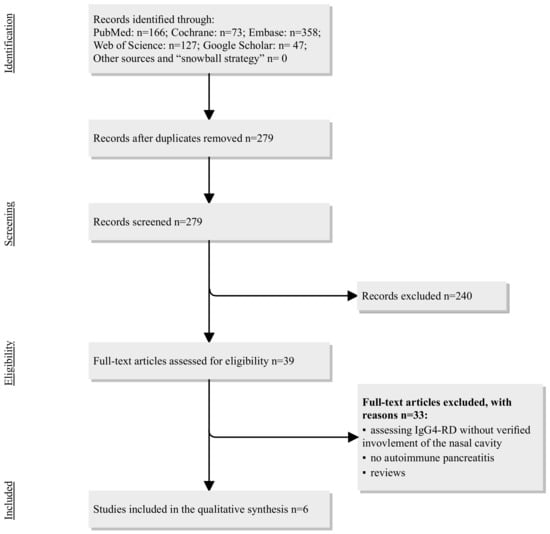 The systematic review identified six studies, with a total of 143 patients included (Table 2). Two studies presented case reports [14,15], and four described case series [16,17,18,19]. Four studies were from Japan [14,16,17,19] one from China [18], and one from the USA [15]. The symptoms reported in sinonasal IgG4 engagement included nasal crusting, nasal blockage, secretions, and hyposmia. Moteki et al. evaluated steroid treatment in a cohort of 31 patients with IgG4-related disease and found 7 patients with both AIP and sinonasal engagement, presenting with nasal obstruction, rhinorrhea, postnasal drip, and anosmia, as well as elevated IgG4 in serum [16]. After approximately three months of prednisolone administration, AIP improved in six out of seven patients, serum IgG4 levels markedly decreased, and sinonasal symptoms improved. In a retrospective study, Suzuki et al. found 7 patients (out of 23 reviewed) with AIP and nasal involvement, who were treated with oral corticosteroids and intranasal corticosteroids. Unfortunately, no details of the outcome or follow-up were reported [19]. Cain et al. [15] and Ohno et al. [14] described case reports in patients with AIP and sinonasal engagement. Hanaoka et al. reviewed 108 patients with IgG4-related disease and found five patients with AIP and sinonasal engagement, in whom the chief nasal complaints were hyposmia and nasal obstruction [17]. The largest study so far was published recently by a group of Chinese authors, who performed a cross-sectional study on 408 patients with IgG4-related disease and comorbidity with allergic rhinitis, chronic rhinosinusitis, or both and found 122 patients (30%) who also had AIP [18]. Patients with allergic rhinitis and chronic rhinosinusitis in this study were sensitive to glucocorticoid therapy, and their nasal symptoms either were alleviated or disappeared after treatment, while chronic rhinosinusitis alone was insensitive to glucocorticoid therapy (information on treatment was available only for the whole cohort of patients in this study, and not for AIP separately).