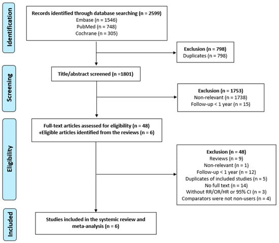 We identified 2599 articles from the three databases (Embase n = 1546, n = PubMed 748, n = Cochrane 305) using the search strategies. After excluding 798 duplicates, 1801 studies were screened for the title and abstract. We excluded 1738 articles that were not related to our research question and 15 articles with a follow-up period of less than 1 year. In the full-text assessment, 48 studies were evaluated, and six eligible studies were added from the reviews. We then excluded nine reviews, one study with irrelevant content, 12 articles with a follow-up period of less than 1 year, five duplicates of included studies, 14 articles without full text, three articles without RR/OR/HR or 95% CI reported, and four articles not using non-users as the comparator. Eventually, this systematic review and meta-analysis included six studies. A flowchart showing the study selection process is shown in Figure 1.