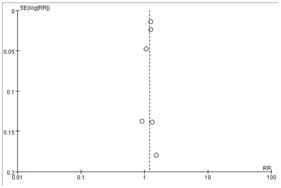Funnel plot of the included studies. The white circles indicate the RR in each study (RR), and the dashed line indicates the pooled risk ratio across these studies. RR of the included studies are symmetric around this dashed line.