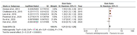 Peakman et al., 2020 [40] was a retrospective cohort study of excellent quality (STROBE-M: 0.90) conducted in the UK. The study population included 3659 older adults with depression and without dementia (mean age: 76.0 ± 7.7 years, 64% female, 82% White). The exposure of interest was all types of antidepressants compared to no use. The mean follow-up was 2.7 years. The HR was adjusted for age, sex, race and ethnicity, marital status, previous diagnosis of depression, comorbidities, and psychotropic use. The adjusted HR was 1.32 (95% CI = 1.01–1.74) for all antidepressants and 1.07 (95% CI = 0.91–1.25) for SSRI compared with no use.
