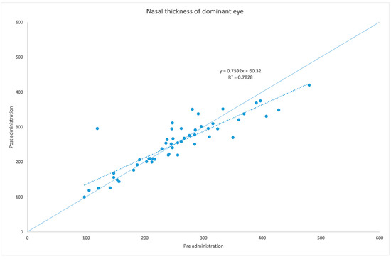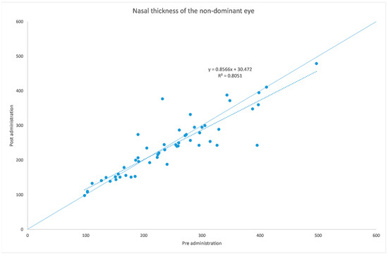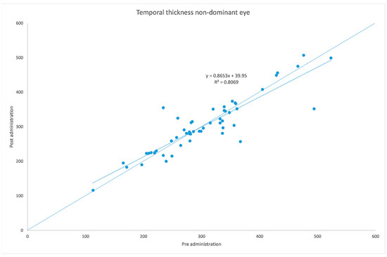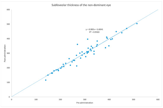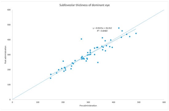 Table 1 and Table 2 summarize both eyes’ data before and after the administration of the mydriatic eye drops in the dominant eye. Figure 1, Figure 2, Figure 3, Figure 4, Figure 5 and Figure 6 show scatter plots showing the distribution of the data collected in both the dominant and fellow eyes at subfoveal, nasal and temporal locations.