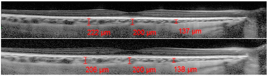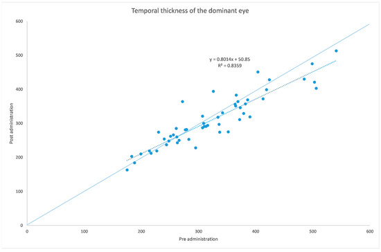 The analyzed data, illustrated in Figure 3 and Figure 7, showed a statistically significant (p = 0.009) ChT reduction in the temporal sector after treatment with tropicamide + phenylephrine. In the subfoveal and nasal sectors, there were no statistically significant (p = 0.94; p = 0.85) ChT changes following the tropicamide + phenylephrine administration. A high correlation was detected between the subfoveal ChT, nasal ChT and temporal ChT in the dominant eyes before and after the tropicamide + phenylephrine administration (r = 0.921, r = 0.885, r = 0.914, all p < 0.001). No significant ChT changes at the subfoveal, nasal and temporal sectors were detected in the untreated eye before and after drops were administered to the fellow eye (p = 0.94; p = 0.41; p = 0.83). A high correlation was detected between the subfoveal ChT, nasal ChT and temporal ChT in the nondominant eyes before and after the tropicamide + phenylephrine administration in the fellow eyes (r = 0.957, r = 0.897, r = 0.898, all p < 0.001).
