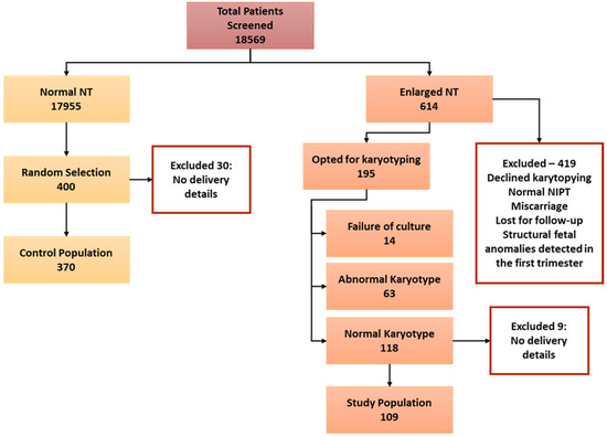 In the study period, 18,569 patient files were screened in the database, where 17,955 cases recorded normal NT measurements and 614 recorded enlarged NT defined as ≥95% (Figure 1). Among the cases with enlarged NT measurements, 419 were excluded since they did not opt for CVS or amniocentesis, had a miscarriage, had abnormal non-invasive prenatal tests, lost for follow-up or had foetal structural anomalies in the first-trimester scan. Among the remaining 195 patients, 63 had an abnormal karyotype, and 14 were excluded due to failure of culture for karyotypes. The population with enlarged NT and normal karyotype of 118 participants were further screened to include only patients with delivery details. The final number in the enlarged NT with normal karyotype was 109. For the control population, 400 patients were randomly selected from the identified pool of 17,955 patients with normal NT. A total of 30 cases were excluded as there were no delivery details, and the final number included in the control group was 370.