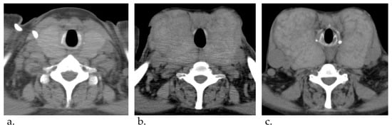 Computed tomography imaging course of thyroid gland enlargement. (a) At 45 years of age. (b) At 52 years of age. (c) At 54 years of age. The thyroid gland gradually was enlarged.