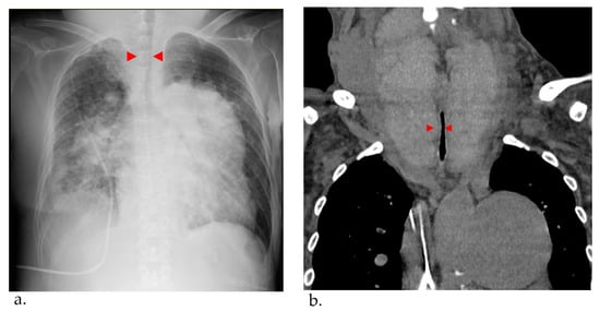 (a) Chest X-ray pulmonary congestion, enlargement of the cardiac shadow, and airway stenosis were detected (red arrowhead). (b) Computed tomography Thyroid gland enlargement was observed. Tracheal compression and stenosis due to goiter (red arrowhead).