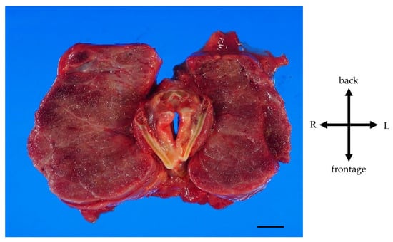 A pathological autopsy was performed. The gross thyroid findings included diffuse enlargement (weight 675 g, size 14 cm × 6 cm, normal weight 20~30 g, normal size 5 cm × 2.5 cm) and compressive constriction of the upper airway by the thyroid gland (Figure 4).