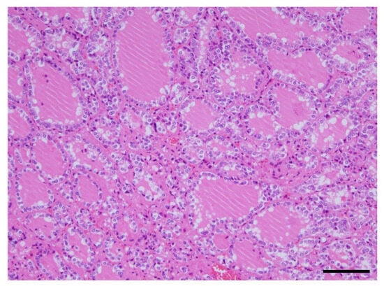 Histological findings of the thyroid gland. The image of an adenomatous goiter was presented. No malignant findings were observed. This showed increased thyroid follicle growth and increased colloidal resorption, suggesting a hyperthyroid state. Scale, 100 µm. HE staining.