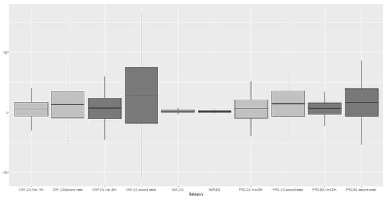 There have been no statistical differences in RBC measurement (below the lower limit) in the first 24 h (EG 33.3% (17 of 51) vs. CG 28.6% (18 of 63), p = 0.73); however, the average number of red blood cells during the whole stay at the neonatal ward was significantly lower in EG in comparison to CG (EG 2,7 vs. CG 2,9 [T/l]; p = 0.003). The lab blood count of selected parameters during the first 24 h of the infant’s life and the ones obtained prior to ophthalmological treatment (tested in the second week: EG mean GA 28 ± 1, CG 30 ± 1) included White Blood Cells (WBC), neutrophils (Neu), lymphocytes (LYM), platelet count (PLT), C-reactive protein (CRP) and procalcitonin (PRC). The lab results obtained during the first 24 h reveal statistically significant differences between the levels of WBC, PLT and the measurements taken prior to the treatment: CRP and LYM (Figure 1, Supplementary Table S1). Laboratory test results indicating reduced parameters were based on the norms described in the literature for the exact days of a premature infant’s life [16] (Figure 1, Supplementary Table S1, Table 2).