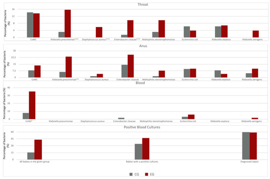 The percentage of bacteria in blood cultures was presented in the examined groups (Figure 2): all neonates (EG 43.1% [22 of 51] vs. CG 15.9% [10 of 63]), neonates with positive cultures (EG 46.8% [22 of 47] vs. CG 34.5% [10 of 29]) and neonates fulfilling sepsis criteria (EG 59.1% [13 of 22] vs. CG 60% [6 of 10]).
