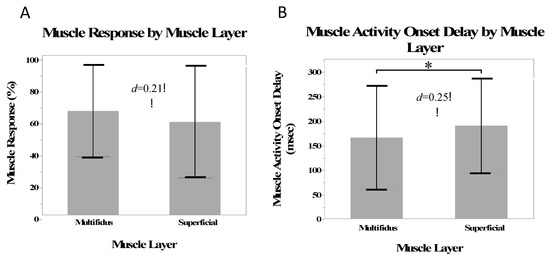 There was a small effect size (d = 0.20) and no statistical difference between the multifidus and superficial muscles in the number of muscle responses (β = 3.4%, SE = 2.83%, p = 0.23). There was a small effect size (d = 0.25) and significantly shorter muscle activity onset delays in the multifidi than in the superficial muscles (β = −13.0 ms, SE = 5.6 ms, p = 0.02) (Figure 2).