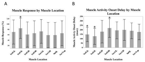 Mean muscle responses (A) and mean muscle activity onset delays (B) across all muscle locations. Stars indicate statistically significant differences from the mean.