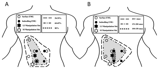 The presence of a muscle response was determined with a double-threshold method that contained amplitude and duration components optimized specifically for the HVLA manipulations [32]. Muscle response was calculated by recording the number of locations with a response and dividing this by the total number of muscle locations evaluated, expressed as a percentage (Equation (1)).