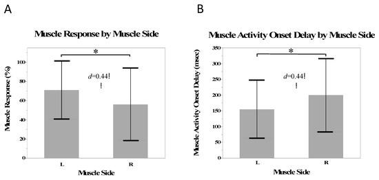 There was a small effect size of side on the muscle response (d = 0.44) and a greater number of responses in the muscles on the left side than the right side (β = 7.5%, SE = 3.0%, p = 0.02). There was a small effect size (d = 0.44) and significantly shorter muscle activity onset delays in the muscles on the left side compared with the right (β = −23.0 ms, SE = 6.7 ms, p < 0.001) (Figure 5).