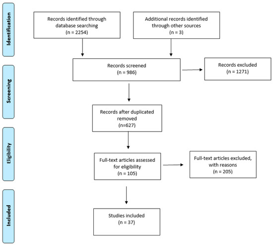 A total of 2257 articles were identified after searching the databases; they were analyzed based on titles. After excluding studies on open fractures in adult patients and studies focused on small segments, 986 articles were obtained. After excluding duplicates, 627 studies were analyzed based on their abstracts. After this screening, 310 articles were selected, and among them, only 105 articles were analyzed based on their full text. After applying the mentioned exclusion criteria, 37 studies were finally used for the present article (Figure 1).