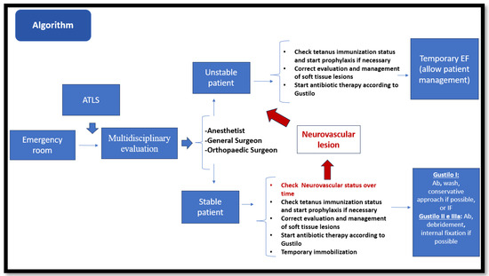 - Mauffrey, C.; Bailey, J.R.; Bowles, R.J.; Price, C.; Hasson, D.; Hak, D.J.; Stahel, P.F. Acute management of open fractures: Proposal of a new multidisciplinary algorithm. Orthopedics 2012, 35, 877–881. [Google Scholar] [CrossRef]