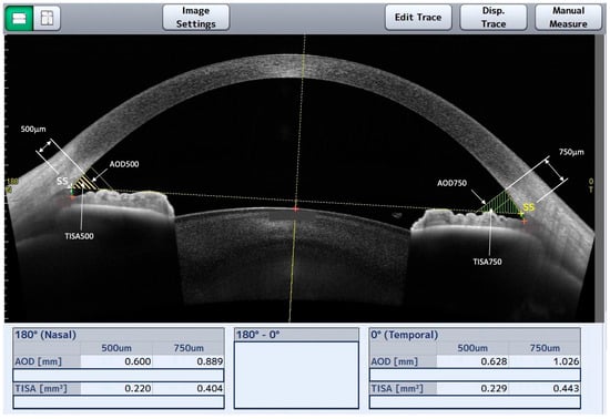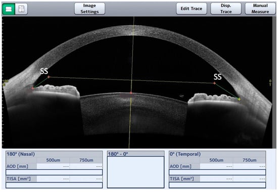 Initially, a masked observer recorded the data of the nasal and temporal TISA500, TISA750, AOD500, and AOD750 parameters, derived from the automatic identification of SS performed with the CASIA2. The definition of AOD is the distance between the cornea and iris along a line perpendicular to the cornea at a specified distance (in μm) from the SS []. TISA, which can be tested and evaluated as well as AOD at several distances from the SS, is defined as the trapezoidal area with the following boundaries: anteriorly, the AOD; posteriorly, the line perpendicular to the plane of the inner corneoscleral wall drawn from the scleral spur to the opposing iris; superiorly, the inner corneoscleral wall; and inferiorly, the anterior iris surface []. The CASIA2 software utilizes a basic edge detection technique to identify the location of the scleral spur–uvea edge line, enabling SS detection. After obtaining the CASIA2 automatic ACA measurements, the masked observer intentionally relocated the SS to an incorrect position and saved the scan to minimize observer interpretation biases (Figure 1). Subsequently, the manual localization of the SS was carried out using the CASIA2 software tools (Version 3G.1) to obtain the measurements of these same parameters. The ciliary muscle and the bump method were used to identify the SS (Figure 2) []. This evaluation was performed by one glaucoma specialist with experience analyzing AS-OCT (G.E.) and one trained glaucoma fellow (K.I.). The evaluators were masked to the origin of the image data to ensure the anonymity of the eyes and participants. Each examiner evaluated each group of images independently (116 images/examiner). The second evaluation of the set of images per eye was performed 2 weeks after the first analysis.