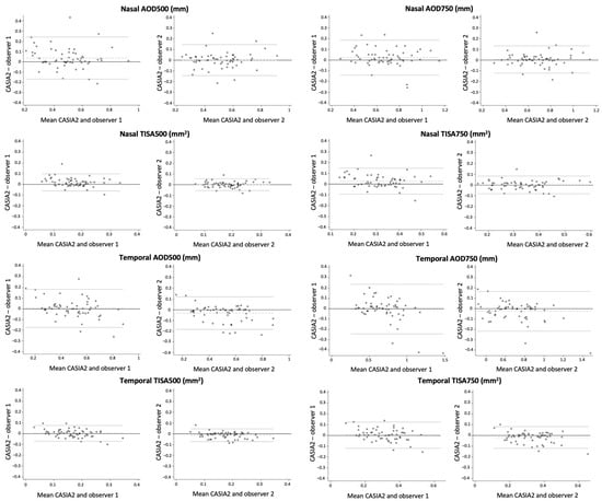 Bland–Altman plot: comparison of nasal and temporal ACA parameters between CASIA2 and both observers.