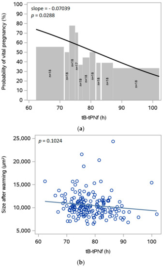 The expansion of the blastocyst during embryo culture was not measured directly. As an indicator of expansion, differences between morphokinetic timepoints were investigated, i.e., tB-tSB, tB-tPNf, tB-t8 and tB-t5. Of these, a significant association with the probability of clinical pregnancy after SVBT was found for tB-tPNf (p = 0.0288; Figure 4a). There was also an association between tB-tPNf and the blastocyst size after warming (Figure 4b), as well as the rate of re-expansion (Figure 4c). This association was statistically significant for the rate of re-expansion but not for the size after warming.