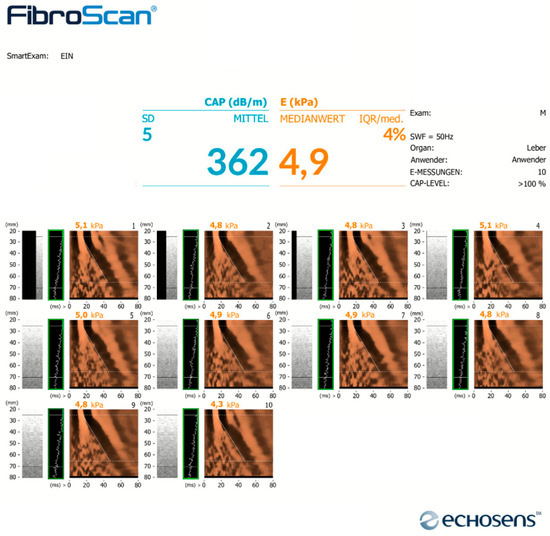 A subgroup of participants received an ultrasound of the liver, followed by sonographic transient elastography (TE) using FibroScan®. TE is a sonographic method used to evaluate the elastic properties of tissues. Tissue elasticity is expressed as tensile modulus in kPa. For the classification of the stage of fibrosis, the following cut-off values were applied: for the diagnosis of significant fibrosis (F ≥ 2), 8.0 kPa; for the diagnosis of severe fibrosis (F ≥ 3), 9.0 kPa; for the diagnosis of liver cirrhosis (F = 4), 11.0 kPa [27]. Examinations were carried out under fasting conditions and during breathing baseline. Ten measurements were performed in each subject and median tensile modulus was calculated for further analyses. TE measurements were defined as reliable if the interquartile range was <30%. Controlled attenuation parameter (CAP) was assessed as part of TE. CAP enables a quantitative measurement of hepatic fat content by measuring ultrasound attenuation. Results are expressed in dB/m. The following cut-offs for the diagnosis and grading of steatosis hepatis were applied: exclusion of steatosis, <248 dB/m; steatosis I°, 248–267 dB/m; steatosis II°, 268–279 dB/m; and steatosis III° > 280 dB/m [24]. CAP and TE were adjusted for body weight, body mass index and waist circumference (Figure 1).