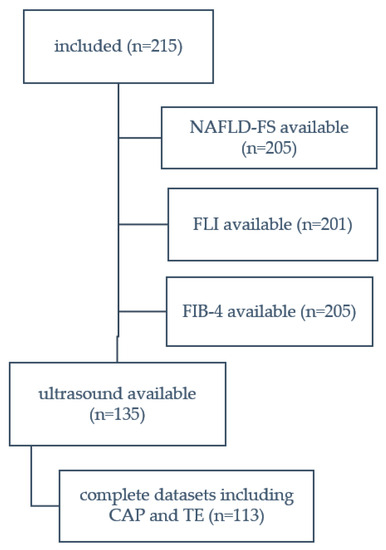 Two hundred and fifteen patients were included in our analysis, thereof 52.1% had PAI and 47.9% SAI. A complete data set, including FLI and NAFLD-FS as well as CAP and TE, was collected in n = 113 participants. (Figure 2).