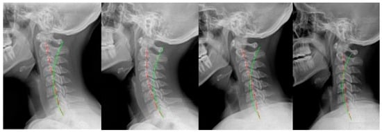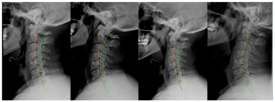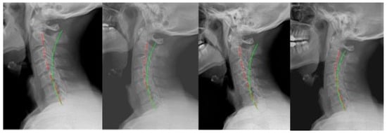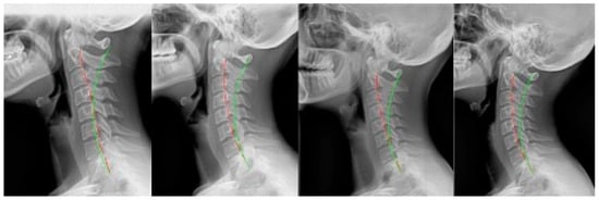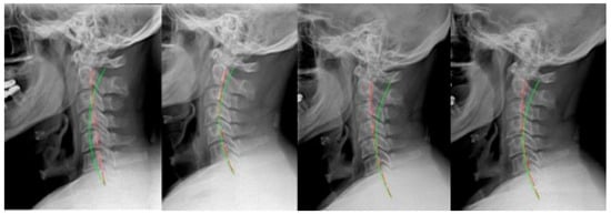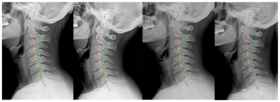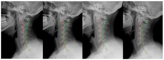 - Harrison, D.D.; Harrison, D.E.; Janik, T.J.; Cailliet, R.; Ferrantelli, J.R.; Haas, J.W.; Holland, B. Modeling of the sagittal cervical spine as a method to discriminate hypolordosis: Results of elliptical and circular modeling in 72 asymptomatic subjects, 52 acute neck pain subjects, and 70 chronic neck pain subjects. Spine 2004, 29, 2485–2492. [Google Scholar] [CrossRef] [PubMed]