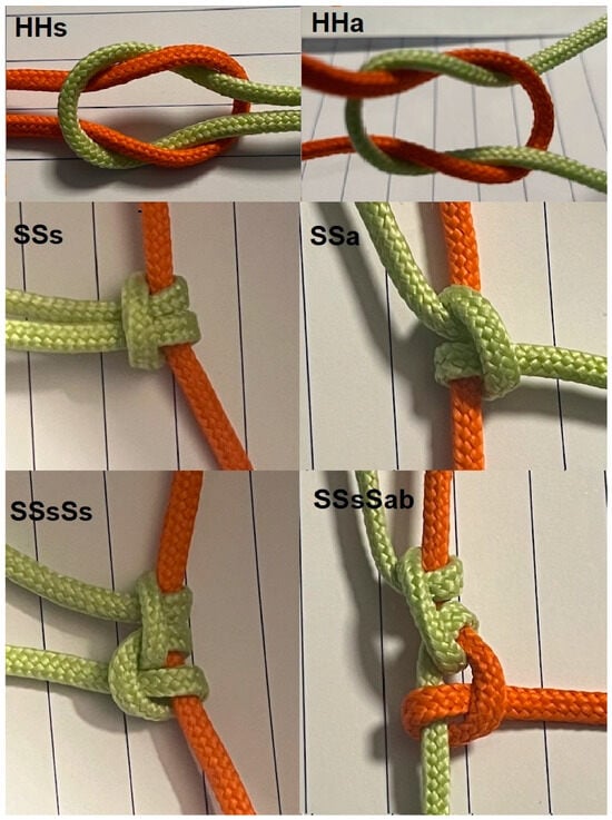 Loop and knot security are known to vary with the total number of throws and the number and rotation of half-knot or half-hitch sequences []. However, only recently were the mechanisms understood for 2.0 polyfilament sutures as reviewed in []. The observations can be summarised as follows. Surgical knots are sequences of half-hitches (S) or half-knots (H) (Table 1). Half-hitches result from pulling one end of the suture, called the passive end. Half-knots (H) require symmetrical pulling of both ends. Half-hitches usually consist of one throw and half-knots of one to three throws. Loop security of half-knots increases with the number of throws []. Loop security of sliding half-hitches increases with the number of half-hitches and with alternate rotation. Rotation is alternate when the rotation of the same active end is the opposite compared to the previous one. Half-hitch sequences with opposite rotation remain in one plane, with both ends on one side squeezing the passive end symmetrically and firmly. Knot security of half-knot and half-hitch sequences also varies with rotation [,,,]. Half-knot sequences with similar rotation result in an insecure granny knot, whereas opposite rotation results in a flat square knot, visually recognised as symmetrical in one plane []. Changing the active and passive ends, as conducted in bimanual suturing or when making blocking half-hitches, has a similar effect as changing rotation. Therefore, similar rotation improves knot security of blocking half-hitches or knots made with bimanual suturing [] (Figure 1).
