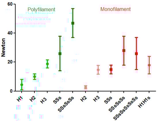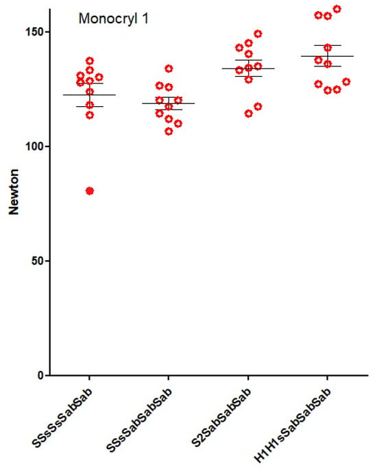 Loop security of Monocryl 1 is low, with large standard deviations indicating variability. Loop security is 2.7 ± 1.0 N for H2, 14.7 ± 3.0 N for H3, 15.4 ± 2.4 N for SSs, 28.3 ± 10 N for SSsSsSs, 26.5 ± 11.5 N for SSsSsSsSsSs, 9.9 ± 5.1 N for S2S1, and 17.7 ± 6.2 N for H1H1s (Figure 2).