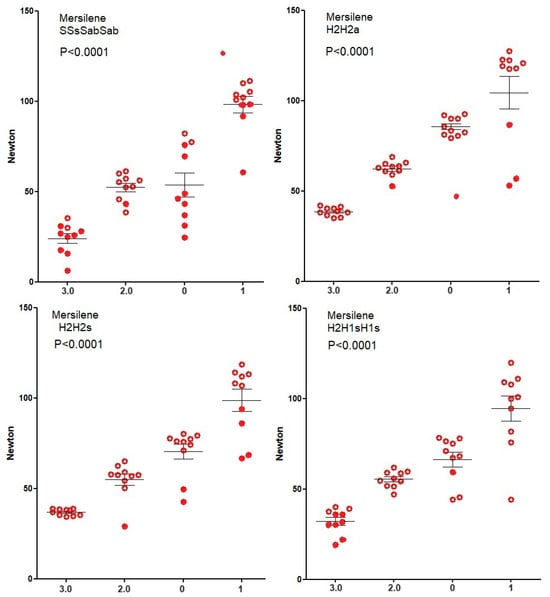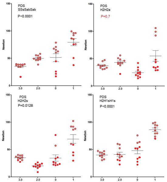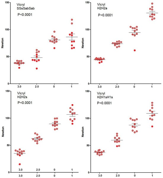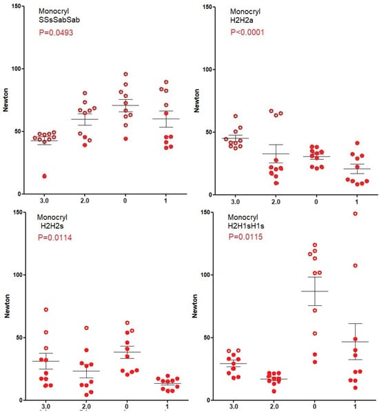 Knot security of Vicryl (Figure 3) and Mersilene (Figure 4) increase (Spearman) with suture diameter for all four knots (all p < 0.0001) because breaking forces of sutures increase. However, for PDS (Figure 5), knot security only increases with suture diameter for SSsSabSab (p < 0.0001), H2H2s (p = 0.0128), and H2H1sH1s (p < 0.0001) but not for H2H2a (p = 0.7). For Monocryl (Figure 6), knot security slightly increases only for SSsSabSab (p = 0.0493) and H2H1sH1S (p = 0.0115) and decreases for H2H2 (p < 0.0001) and H2H2s (p = 0.0114). This is caused by the unpredictable number of knots sliding open, being 22% for polyfilament and 51% for monofilament sutures (<0.0001) and increasing when suture diameters are larger (all p = 0.0171). However, this increase with diameter is not consistent neither for the type of sutures (Vicryl p < 0.0001, PDS p = 0.0003, Monocryl p < 0.0001, mercilene p = 0.67) nor for the knot combination (SSsSabSab p = 0.4692, H2H2a p = 0.0001, H2H2s p = 0.1184, H2H1sH1s p = 0.1340). Also, the excellent H3H2a knot with Vicryl results in many insecure knots with Monocryl 1).