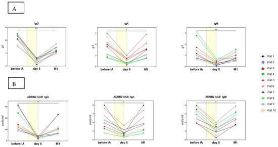 (A) Levels of IgG, IgA, and IgM before IA, the morning before the 5th IA, and 4 weeks after IA. (B) Levels of ADRB2 AAB IgG, ADRB2 AAB IgA, and ADRB2 AAB IgM before IA, the morning before the 5th IA, and one month (M1) after IA. The period of IA treatment is indicated by a yellow area. ADRB2 AABs were determined by CellTrend GmbH, Luckenwalde, Germany, using ELISA technology. Statistics performed by Wilcoxon matched paired-signed rank test, * p < 0.05, ** p < 0.01.