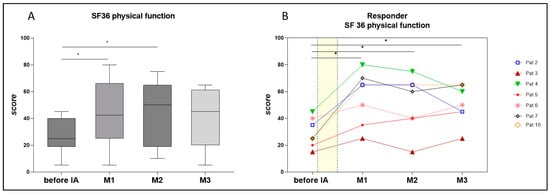 The SF36-PF score, defined as the primary outcome parameter, ranged from five to 45 at the baseline (median 25). Seven patients reported an increase in SF36-PF by 10 to 45 points at week 4 after IA (to median 42.5), as shown in Table 1 and Figure 2A for all patients and Figure 2B for individual responding patients.