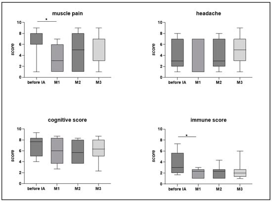 Responders also described improvements in the core symptoms of pain, cognition, and immunological symptoms. Figure 3A shows the progression in the responding patients. Improvements in muscle pain and the immune score were significant after four weeks (p < 0.05), while improvements in the cognitive score and headache did not reach statistical significance. However, only four of the seven responders reported headaches before IA.