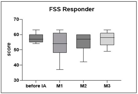 Fatigue in responding patients (n = 7) was assessed by the Fatigue Severity Scale (FSS) before IA and after months 1, 2, and 3. A higher score indicates more severe fatigue. Statistics performed by Wilcoxon matched paired-signed rank test.