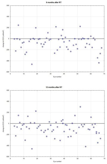 Data on 68 eyes (34 patients) were analyzed. The results obtained during follow-up visits referred to the results of the same eyes collected before radiotherapy, which were treated as a control group.