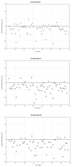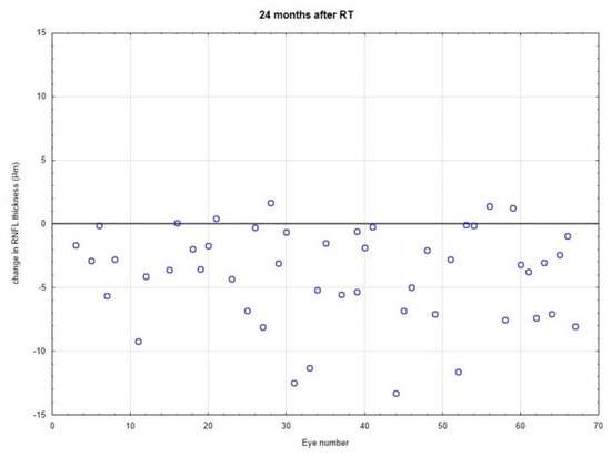 Changes in retinal nerve fiber layer (RNFL, µm) thickness at 6, 12, 18, and 24 months after irradiation. Each point represents a difference in RNFL measurement value for the individual eye. Line 0 represents the same values. Almost all patients had a reduction of RNFL.