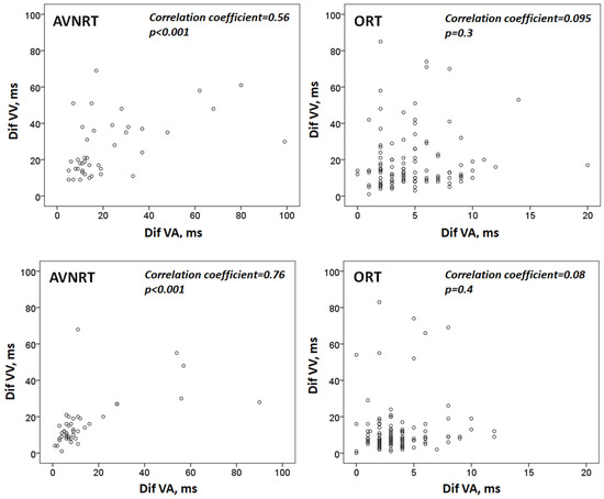 Finally, in contrast to previous studies, we have included all cases of tachycardia even with RR interval irregularity. According to our data, VA interval variability is useful in distinguishing atypical AVRTN from ORTs even in tachycardias with cycle length irregularity. This is so because RR interval variability correlates significantly with VA interval variability in atypical AVRTN but not in ORT (Figure 2).