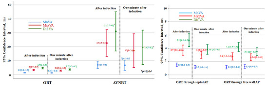 Additionally, in nine (20%) patients with atypical AVNRT and in eleven (10%) with ORT, the Dif-VA increased from induction to one minute, with the maximum increment being of 29 ms and 6 ms, respectively.