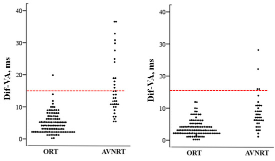 Scatterplot showing the individual values of the difference between the maximum and minimum VA interval (Dif-VA) measured after induction in patients with orthodromic reciprocating tachycardia (ORT) and those with atrioventricular nodal reentrant tachycardia (AVNRT). The line drawn at 15 ms represents the discriminant value distinguishing the patients with AVNRT from those with ORT. Left, after induction; right, one minute after induction.