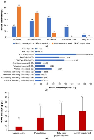 Health-related quality of life outcomes. (a) Health status 1 week prior and within 1 week of RBC transfusion; (b) HRQoL outcomes (mean FACT-An, PHQ-9, GAD-7 domains) (for subscales and FACT scales, higher scores imply better outcomes; for PHQ-9 and GAD-7, higher scores imply worse outcomes); (c) WPAI outcomes. Three individuals indicated that they are employed; however, they had not worked in the past 7 days. One of those individuals missed 40 h of work in the past week due to β-thalassemia. FACT: Functional Assessment of Cancer Therapy; FACT-An: FACT-Anemia; FACT-G: FACT-General; GAD-7: Generalized Anxiety Disorder-7; HRQoL: health-related quality of life; PHQ-9: Patient Health Questionnaire-9; RBC: red blood cell; SD: standard deviation; TOI: Trial Outcomes Index; WPAI: Work Productivity and Activity Impairment.