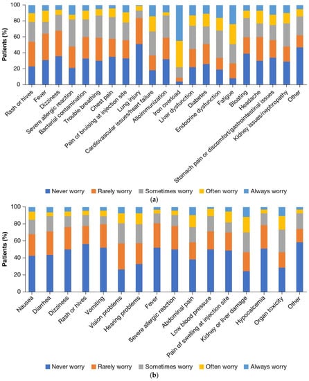 In terms of transfusion side effects, patients reported spending the most time worrying about iron overload, fatigue, endocrine dysfunction, and cardiovascular issues (Figure 4a).