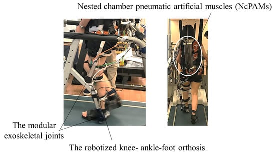 Robotized knee-ankle-foot orthosis. We used a robotized knee-ankle-foot orthosis. The device consisted of an orthosis, Modular Exoskeletal Joints, nested chamber pneumatic artificial muscles (NcPAMs), and a control personal computer. The unit of NcPAMs was carried on the patient’s back and was relieved by a body-weight support device. The four PAMs assisted in knee flexion and extension, ankle dorsiflexion, and plantar flexion.