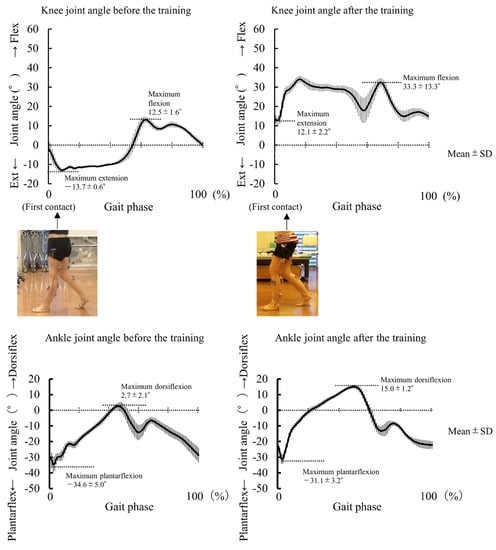 Knee and ankle joints angle on the affected side during gait before and after nine days of robot-assisted gait. The graphs indicate the knee and ankle joints angle during barefoot overground walking before (left) and after training (right). The horizontal axis indicates one gait cycle, with 0% indicating initial foot contact on the affected side and 100% indicating the next contact. The thick solid line represents the mean angle, and the thin vertical line represents the standard deviation. As the patient’s photographs show, genu recurvatum was seen before the training, but it disappeared after the training. The maximum knee extension angle changed from −13.7° to 12.1°. The maximum knee flexion angle changed from 12.5° to 33.3°. The maximum ankle plantarflexion angle changed from −34.6° to −31.1°. The maximum ankle dorsiflexion angle changed from 2.7° to 15.0°.
