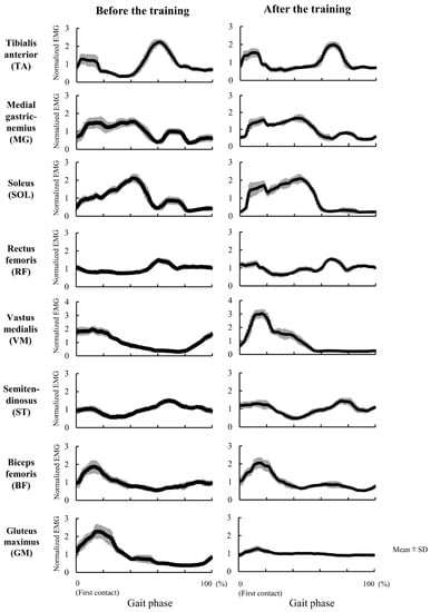 Electromyography (EMG) on the affected side during gait before and after nine days of robot-assisted gait training. Graphs indicate normalized electromyography (EMG) during barefoot overground walking before (left) and after training (right). The horizontal axis indicates one gait cycle, with 0% indicating initial foot contact on the affected side and 100% indicating the next contact. The thick solid line represents the mean normalized EMG, and the thin vertical line represents the standard deviation. We assessed eight muscles: the tibialis anterior muscle, the medial gastrocnemius muscle, the soleus muscle, the rectus femoris muscle, the vastus medialis muscle, the semitendinosus muscle, the biceps femoris muscle, and the gluteus maximus muscle. After the training, the genu recurvatum disappeared, and the activity of the vastus medialis muscle increased in the early stance phase.