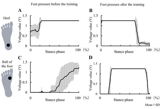 Foot pressures of the heel and the ball of the foot on the affected side during gait (stance phase) before and after nine days of robot-assisted gait training. Graphs indicate the voltage values of the foot pressures of the heel and the ball of the foot on the affected side. The horizontal axis indicates one stance phase, with 0% indicating initial foot contact on the affected side and 100% indicating toe off on the affected side. The thick solid line represents the mean voltage value, and the thin vertical line represents the standard deviation. Heel pressure responded throughout the stance phase before training (A), however, after training the response decreased in about 80% of the stance phase (B). Ball of the foot pressure was slow to rise in response before training (C), and the reaction started in the latter half of the stance phase, after training, the reaction started in about 20% of the stance phase (D). Data from the two sensors suggested an increase in forward load transfer in the stance phase.