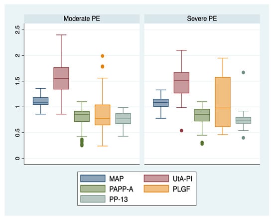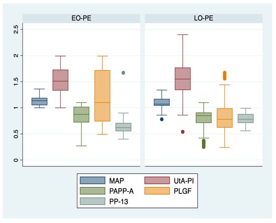 Additionally, our results showed that the serum values of PLGF determined in the first trimester of pregnancy, expressed as MoM, were significantly higher for the EO-PE, and severe PE subgroups (p < 0.001), while the serum levels of PP-13 were significantly lower for the LO-PE subgroup (p = 0.003). These findings are in line with data published in the literature that confirmed the superior predictive performance of PLGF for early onset and severe types of PE [,,], and of PP-13 for LO-PE [].