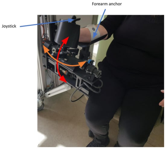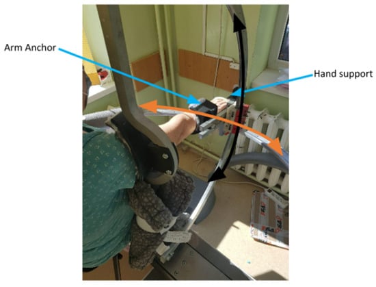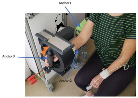 ASPIRE (see Figure 1) is a spherical robot with two degrees of freedom (DOFs) that targets shoulder rehabilitation and is able to perform flexion/extension (black arrow) and abduction/adduction (orange arrow) motions. The hand is placed in a special support, and the arm is fixed with a Velcro band in the anchor support.
