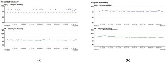 Each patient’s heart rate variability and oxygen saturation were monitored using an integrated finger pulse oximeter. The SpO2 and heart rate remained stable during each session; an example is given in Figure 4a,b.