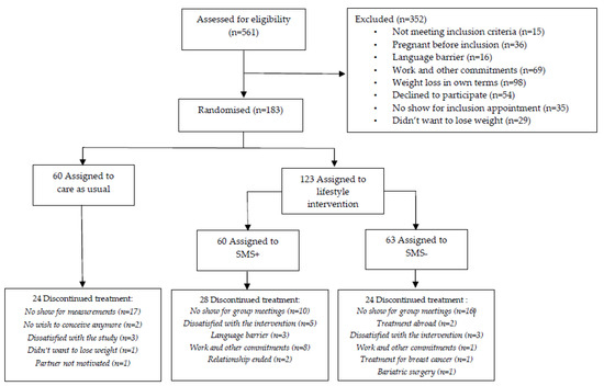 A total of 561 women were eligible for the trial between 2 August 2010 and 11 March 2016. Figure 1 shows the participation selection flow-chart. To summarize, 26 women were included in the pilot study; 352 women could not participate because of various reasons; and finally 183 women were randomly assigned to one of the three arms of the study: (1) SMS+ group (n = 60), (2) SMS− group (n = 63); resulting in a total of n = 123 women in the LSI group, and (3) CAU group (n = 60). Baseline characteristics were presented in Table 1. Median age was 29 years (26–32)for LSI and 28 years (26–32) for CAU. BMI at baseline was 33.6 (30.8–36.6) for LSI and 30.6 (29.3–34.3) for CAU. Time attempting to conceive before the start of the study was 24 (15–38) and 23 (14–35) months for the LSI and CAU groups, respectively. The majority of the participants were nulliparous with 77.7% in LSI and 75.9% in CAU. Our previous results from this RCT demonstrated a statistically significant (p < 0.001) within-group mean weight loss of 7.87 kg in SMS+, 4.65 kg in SMS− and 2.32 kg in CAU after one year [19]. The following pregnancy results are based on calculations by the Erasmus MC using non-public microdata from Statistics Netherlands.